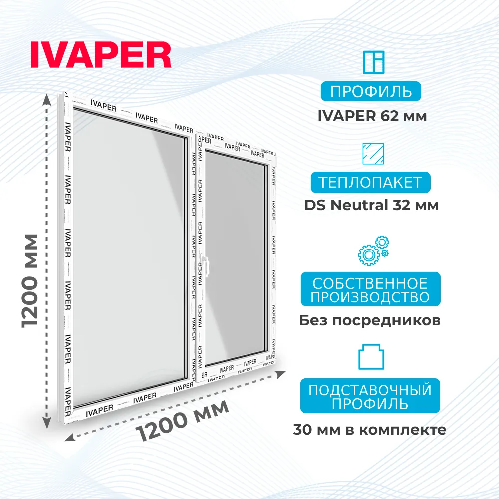 Окно 1200 х 1200 мм, IVAPER 62 (Фурнитура UPT), двухстворчатое, поворотно-откидное правое, теплопакет DS Neutral
